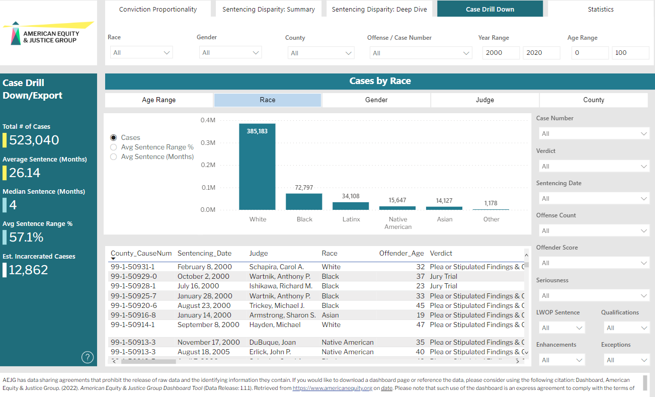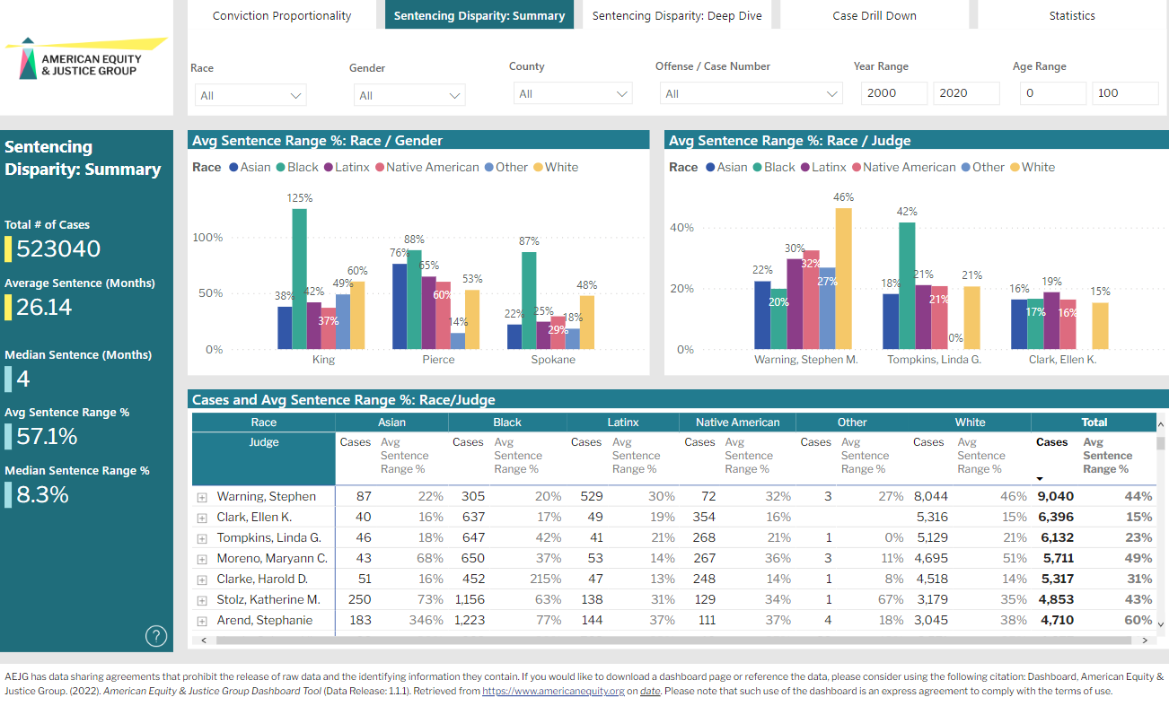 AEJG built and maintains these Equity Dashboards to help you consider how each choice in the life of a criminal case may contribute to, reflect, or help resolve disproportionality and inequity. To start, explore our data sources or select a use case to learn more about the Equity Dashboard types.